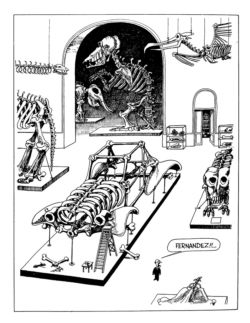 ه) در کنکاش و جستجو برای یافتن پاسخی منطقی، یکبار با مجموعه اسکلتهای مونتاژ شده، شبیه بدنه یک اتومبیل، روبهرو میشویم. این رویداد غیر مترقبه، پاسخی منطقی برای پرسش فوق است. فرناندز اشتباها استخوانهای دایناسورها را شبیه یک اتومبیل، مونتاژ کرده است!