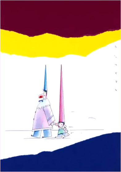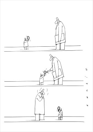 در یکی از کارها مردی بلند قد را در برابر فردی کوتاه قد که ذرهبین به دست دارد، میبینیم. زمانی که مرد بلند قد قصد نزدیک شدن به فرد ذرهبین به دست را دارد، مرد کوتاه قد فاصله میگیرد و همچنان با ذرهبین به او نگاه میکند. در واقع این فرد قصد دارد با زوم کردن بر روی مرد بلند قد از او عیبجویی کند و ایراداتی را در او پیدا کند. این اثر به قضاوت بی چون و چرای ما نسبت به یکدیگر اشاره دارد.