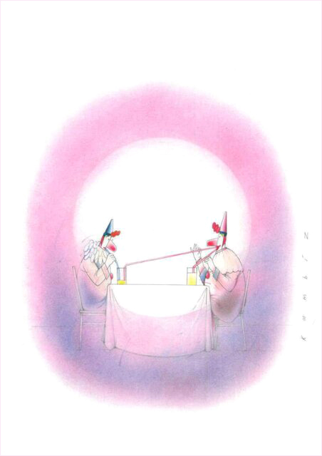 در یکی از آثار نمایشگاه «طراحیهای عمو کامبیز» طرحی دیده میشود که دو دلقک برروی یک میز در حال خوردن یک نوشیدنی هستند. یکی از این دو نفر نی بلندی را در نوشیدنی دلقک دیگر قرار داده و همزمان در حال خوردن از دو لیوان است. در حالی که نوشیدنی فرد دیگر به سرعت در حال اتمام است و گویی از این موضوع نیز ناراحت است ولی با این حال هنوز متوجه اصل داستان نشده و تمام حواسش بر روی لیوان نوشیدنی خود است. فرد دیگر هم با لبخندی موزیانه در حال تمام کردن سهم دلقک دیگر است.