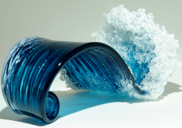 این دو هنرمند با استفاده از حبابهای داخل شیشه و جزئیات سفید فوم حالت یک موج در حال سقوط در دریا را در یک مجسمه به مثابه گلدان ایجاد کردهاند.