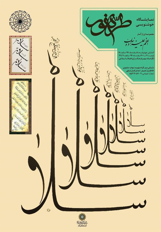 این نمایشگاه مشتمل بر 22 تابلو و دو مرقع  به خط نسخ ایرانی است که با مضامین قرآنی و ادعیه در ترکیباتی غالبا بدیع، از روز 8 اسفند 97  برپا شده است.