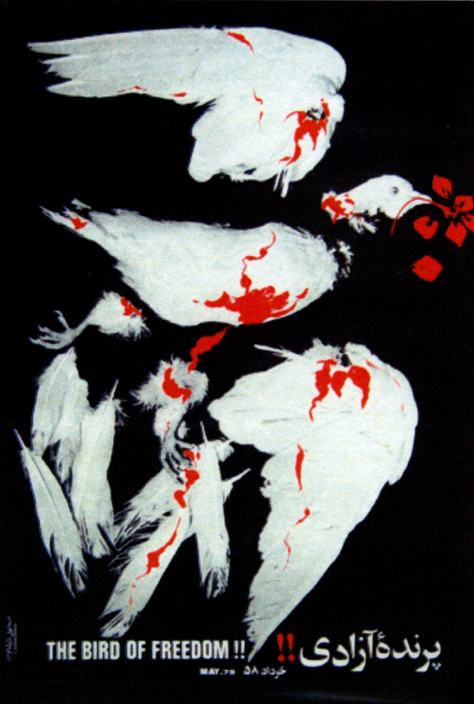 یکی از سمبلهای ویژه در کار طراحان ایرانی گل لاله میباشد که از آن به عنوان سمبل شهادت استفاده شده، از این سمبل هیچ نشانهای در آثار دیگر ملل نیافتم و اصولا در غرب برای کشتهشدگان جنگ و انقلاب بخصوص برای فرد خاصی، پوستر ویژهای طراحی شده و یا تعداد آن آنقدر قلیل بوده که هیچ نشانهای در دست نیست. در ریشهیابی علت حضور این سمبل در آثار طراحان ایرانی میتوان به تاریخ فرهنگی این سرزمین و اشارات زیادی که در ادبیات به ویژه در شعر ایرانی میتوان یافت، استناد نمود.»