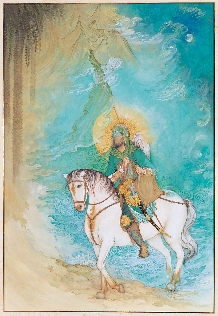 در یک کار عاشورایی دیگر که در آن حضرت ابوالفضل(ع) را کشیدهام اقتدار حضرت را به نشان داده ام و رنگها در کار نشاطآور هستند بخاطر این که ما وقتی یاد حضرت ابوالفضل(ع) میافتیم دلگرمی پیدا میکنیم و غم وجودمان را نمیگیرد چرا که حضرت علمدار کربلا بودند پس باید یک تابلوی فاخر و زیبا رائه بدهیم. اگر بخواهیم بعضی مفاهیم منفی مثل اشقیا را نشان بدهیم، من آن را به صورت دیو در داخل یک اسلیمی کشیدهام چرا که اسلیمی از فرمهای حیوانی است.