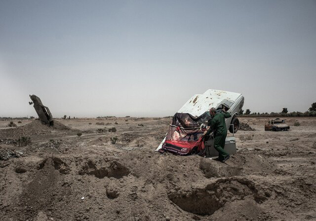 در آثار آرمین امیریان، عکسهایی صحنهسازی شده را میبینیم. کارهای او غالباً دارای فضایی مفهومی هستند. در یکی از عکسها ماشینهایی را میبینیم که در تپهای خاکی فرو رفته و مردی در حال بیرون آوردن یکی از این ماشینهاست. عکس گویای این واقعیت است که مردم باید خودشان سعی در بهبود وضعیت شهر خود داشته باشند وگرنه کسی به دادشان نمیرسد. همانطور که با گذشت ۳۰ سال، هنوز تغییری اساسی در شهر به وجود نیامده و آثار بمب و خمپاره در جای جای شهر مشهود است.