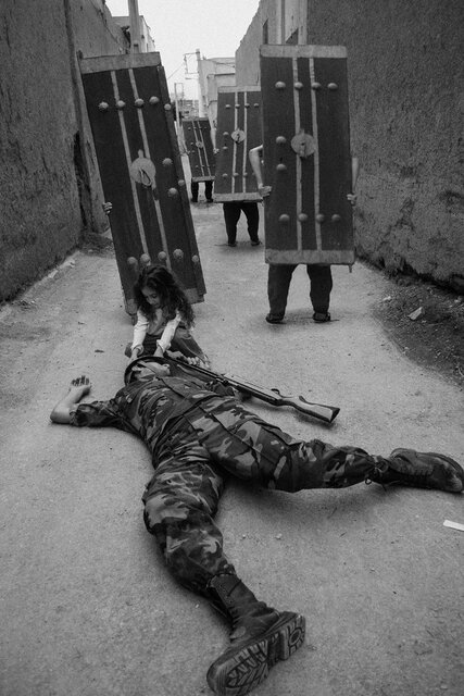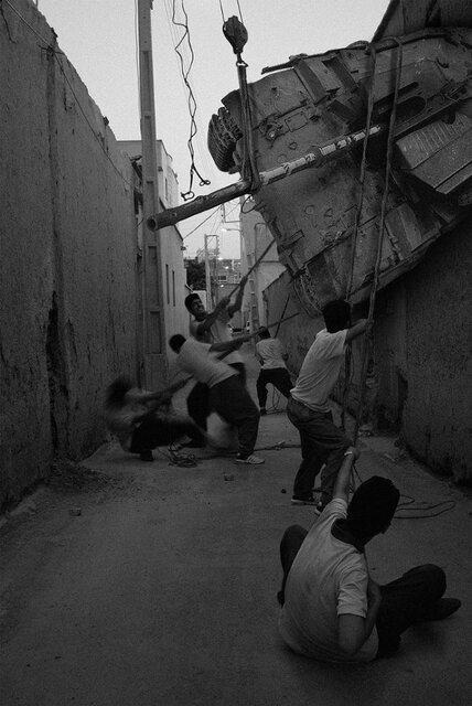 در دو عکس دیگر از این هنرمند که متعلق به مجموعه «مسلخ» هستند و تا به حال در ایران به نمایش گذاشته نشده بودند، افرادی را میبینیم که در یک کوچه تنگ در حال پایین کشیدن یک تانک هستند. تصویر دیگر نیز به خانه بهدوشی و آوارگی مردم خرمشهر با ورود جنگ اشاره دارد. این دو اثر فتومونتاژ هستند.