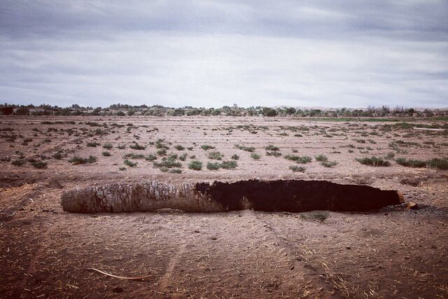 عکس جالبی از مهدی مقیمنژاد در بین کارهای این نمایشگاه به چشم میخورد. در این اثر که برای نمایشگاه «خرمشهر ۳۰+» طراحی شده، تنه افقی نخلی را میبینیم که در محوریت زمینی نسبتاً بایر قرار دارد و قسمتی از آن سوخته است. این اثر نیز همانند دیگر کارها به حجم بالای ویرانیها و تخریب خرمشهر پس از جنگ اشاره دارد. خرمشهر که به دلیل تعداد بالای نخلهایش، خرمشهر نامیده شده، با ورود جنگ دیگر آنگونه که قبلاً بود نیست.