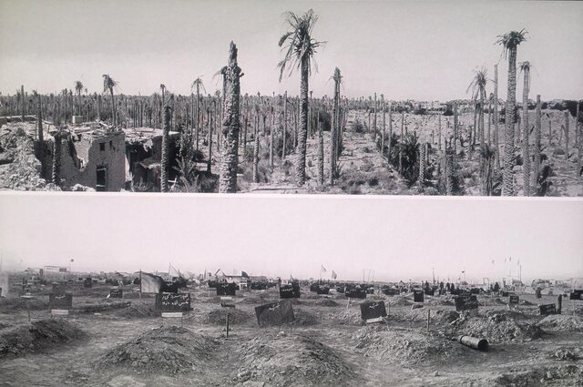 همچنین در یکی از عکسهای جاسم غضبامپور تنها چیزی که دیده میشود مرگ است. وقتی که به دو تصویر که در بالا و پایین هم قرار داده شدهاند نگاه میکنیم متوجه میشویم که تا چشم کار میکند قبر است و ویرانی. عکس بالایی قبرستانی برای نخلها و عکس پایینی قبرستانی برای انسانها.