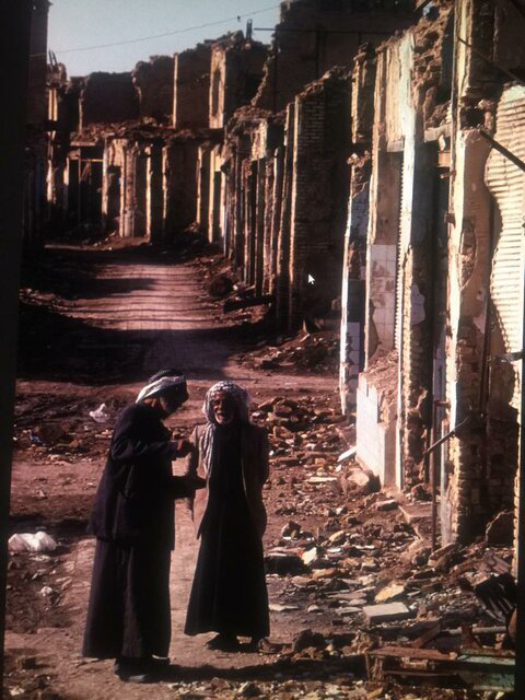 در اثر دیگری از غضبانپور که در سال ۶۸ به ثبت رسیده است، دو کاسب را میبینیم که در بازار تخریب شده صفای خرمشهر ایستادهاند و مشغول صحبت با یکدیگر هستند. این بازار زمانی یکی از پر رونقترین بازارهای خرمشهر بوده ولی بعد از جنگ به حال خود رها میشود و هنوز هم وضعیت بهتری ندارد. فربود میگوید که این دو مغازهدار هر روز صبح به جلوی دکان خود میرفتهاند.