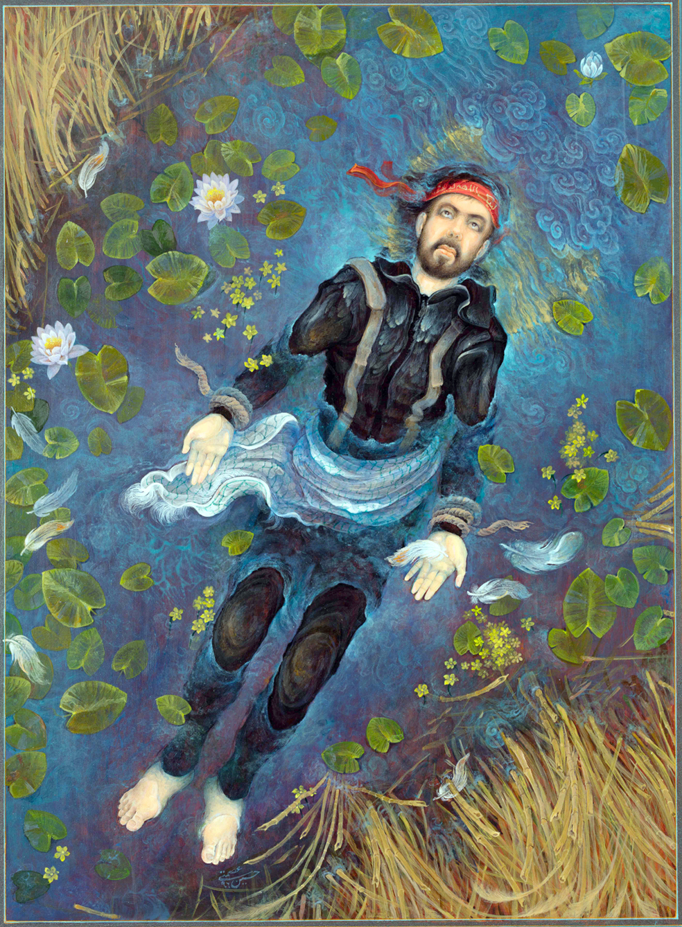 آخرین کاری که انجام دادم عنوانش «چو ایران نباشد تن مباد» هست که میتوان گفت مدافع ایران است. تصویر یک رزمنده ایران است که با عناصر مختلفی از آثار قبل از اسلام و آثار دوران اسلامی در پوشش، خنجرها و شمشیرها دیده میشود که هرکدام از اینها نمادی است از دورههای تمدن ایرانی. البته این اثر به همان شیوه، ترکیبی از کارهای قهوهخانهای ، نگارگری و نقاشی است. دلیل اینکه سعی کردم از نمادهای دورههای مختلف تمدن ایرانی استفاده بکنم این است که متاسفانه در زمانه ما سوالها و مسائل انحرافی شکل میگیرد که ذهن جوانها را گمراه میکند. مثلا ما دوران اسلامی را نادیده بگیریم و برگردیم به دوران قبل از اسلام، بعضیها هم برعکس عمل میکنند و میخواهند تمدن پیش از اسلام را نادیده بگیرند. در صورتی که هر دو اینها جزو تاریخ ایران است. تمام این ادوار، دوران تمدنی ایران است چه قبل از اسلام و چه دوران اسلامی همهاش متعلق به ماست و همهاش باعث افتخار برای ماست. مواریث این دو دوره هم وجود دارد و انسان از دیدنش لذت میبرد. بخاطر همین در آخرین نقاشی که کار کردم سعی کردم از نمادها و عناصر تصویری این دوران استفاده کنم و در واقع ادعای خودم را گفته باشم که تمام این دورهها مال ماست. هم هخامنشیان هم ساسانیان و هم قبل از اینها مال ما هستند و دوره اسلامی هم مال ماست. ما باید تمام اینها را جمع کنیم و استفاده کنیم برای تمدنسازی. رزمندهای که تمام این امکانات را از قبیل اسب و انواع و اقسام جنگ افزارها در اختیار دارد از نظر من آمادگی ما با تمام امکانات است در مقابل کسانی که میخواهند به تمدن ایران صدمه بزنند.