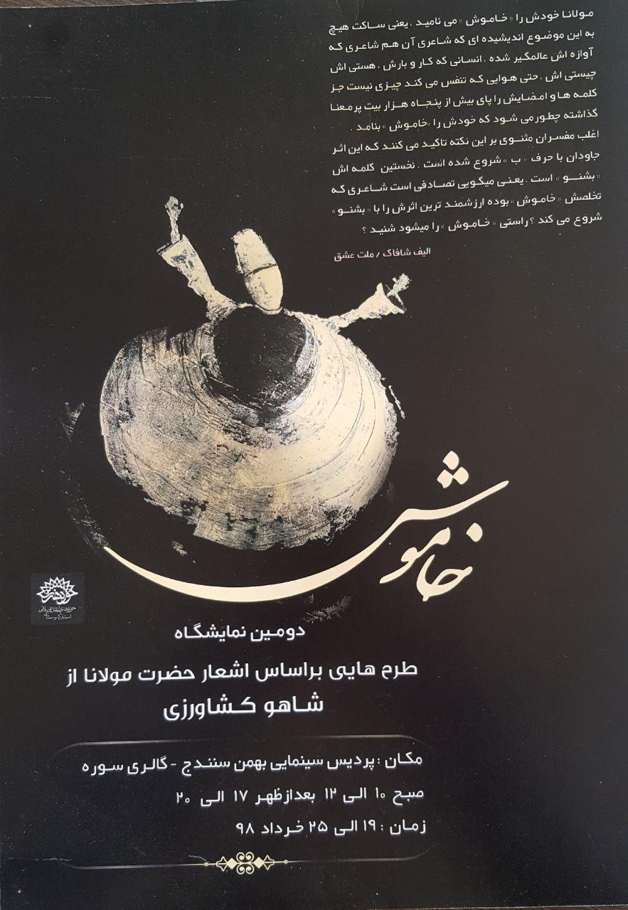 به گزارش روابط عمومی حوزه هنری انقلاب اسلامی استان کردستان ؛ شاهو کشاورزی هنرمند جوان سنندجی در دومین تجربه نمایشگاهی خود ۴۵ تابلوی طراحی خود را که بر اساس اشعار حضرت مولانا در دیوان شمس بر بوم های ساده و در سبک آزاد با استفاده از رنگ آکریلیک به مدت یک هفته از ۱۹ تا ۲۵ خرداد در محل گالری سوره پردیس سینمایی بهمن سنندج در معرض نمایش عموم قرار می دهد .