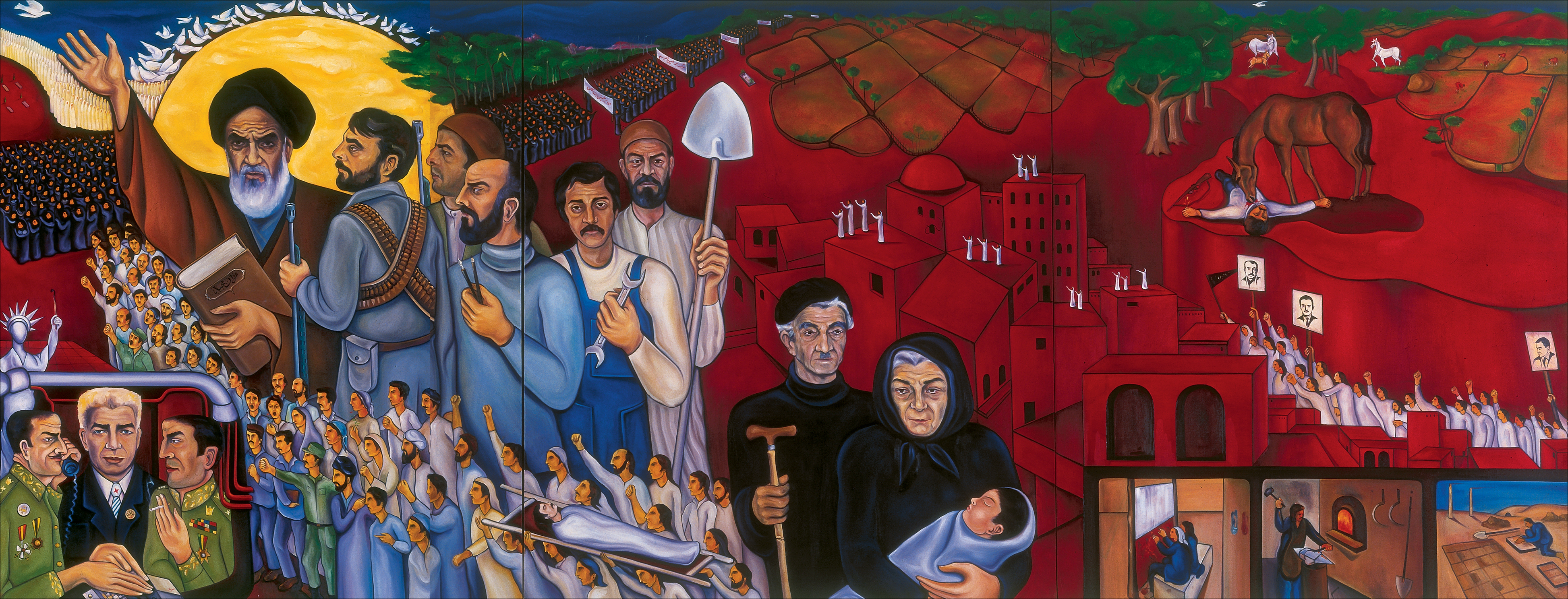 تصویری از انقلاب اسلامی(بخشی از اثر)، بهرام دبیری، رنگ و روغن روی بوم، 140×700(5لته)، 1385