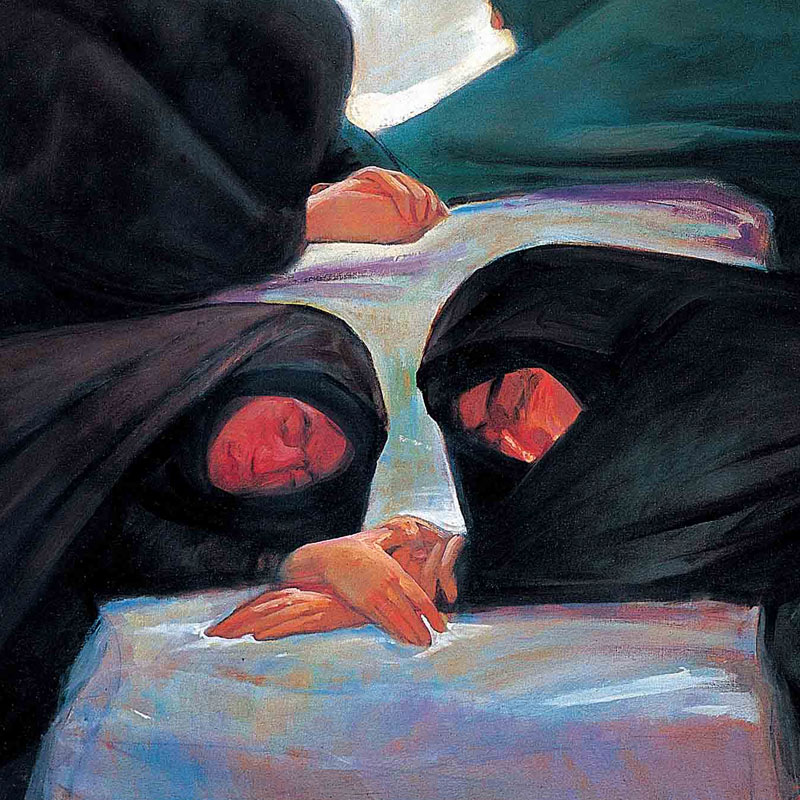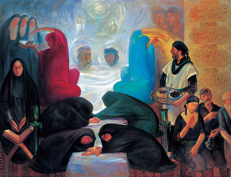 زنها مشغول سوگواری بر پیکرهایی هستند. در گوشه دیگر از تابلو مردها بر سینه خود می زنند و فردی ایستاده با گلاب و خرما و اسفند در دست به درون تابلو می نگرد. این مرد کلید ورود بیینده به بخش دوم نقاشی است بخشی که گویی در زمین نقاشی نشده است . سر دو شهید در میانه تابلو قرار دارد که باکمی توجه متوجه می شویم  که همان دو فیگوری هستند که در بالای تابلو میهمان بزرگی هستند که ساحت آسمانی دارد.
