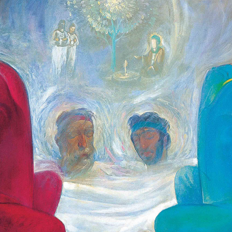 نکته جالب درباره این نقاشی را باید در بخش بالای نقاشی جستجو کرد که بهشت را به تصویر کشیده است و از سنت نقاشی ایرانی بهره گرفته است . عناصردرهم آمیخته شده و  در این بخشی که ماهیتی آسمانی دارد فضای نقاشی تخت تر و آری از حجم پردازیست، که همین اشاره بر غیر مادی بودن جهان آسمانی دارد.