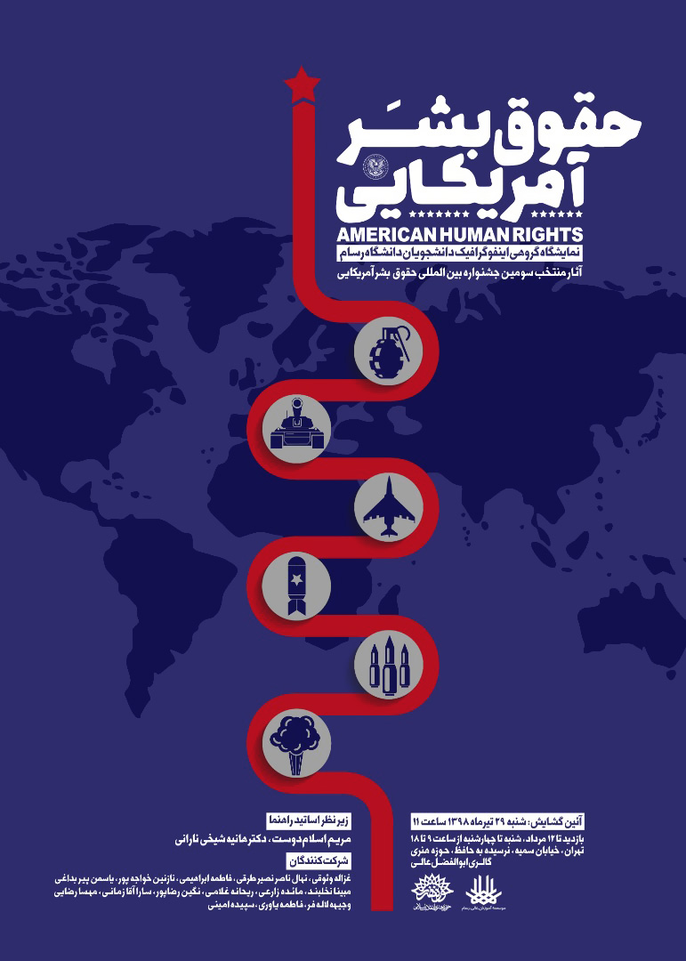 نمایشگاه منتخب آثار اینفوگرافیک از سومین جشنواره حقوق بشر آمریکایی شنبه 29 تیرماه ساعت 11 در گالری ابوالفضل عالی به نشانی: خیابان سمیه، نرسیده به خیابان حافظ طی مراسمی بازگشایی میشود.