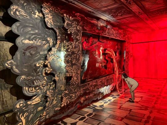این اینستالیشن مروری بر داشتههای فرهنگی و هنری کشور روسیه دارد. یک نقاشی از رامبراند که شاهکار موزه هرمیتاژ روسیه است، موضوع این نمایشگاه شده؛ اما محور اصلی این اینستالیشن اثر کارگردان به نام الکساندر سوکوروف است که به صورت همزمان نشاندهنده تالارهای مشهور موزه هرمیتاژ و محل کار یک هنرمند هستند. در این اثر پنجرهها رو به دنیایی مملو از جنگ و هیاهو است که زندگی مدرن را احاطه کرده است.