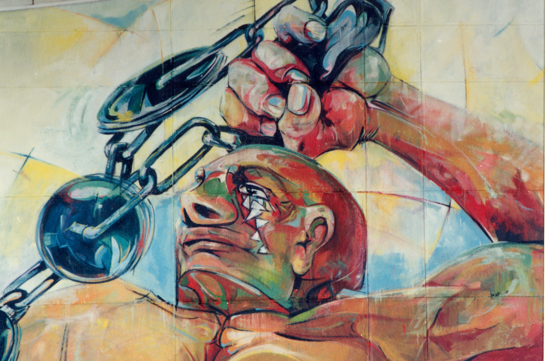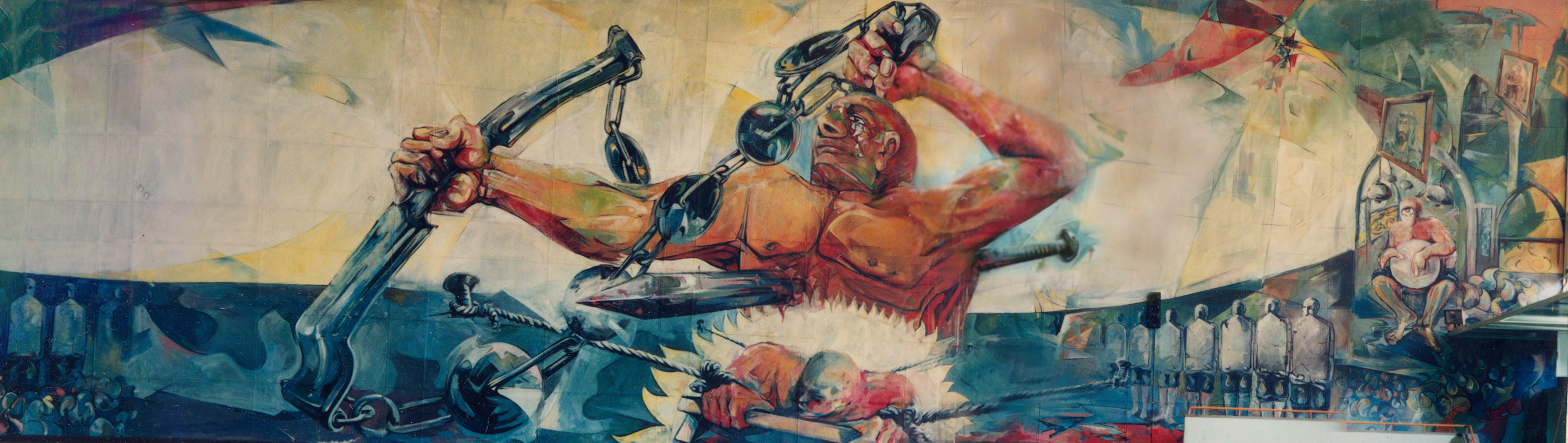 بیانیه ورزشی(بخشی از اثر)، علی اصغر کفشچیان مقدم، رنگ و روغن روی دیوار، 1080 متر مربع، 1366-1369
