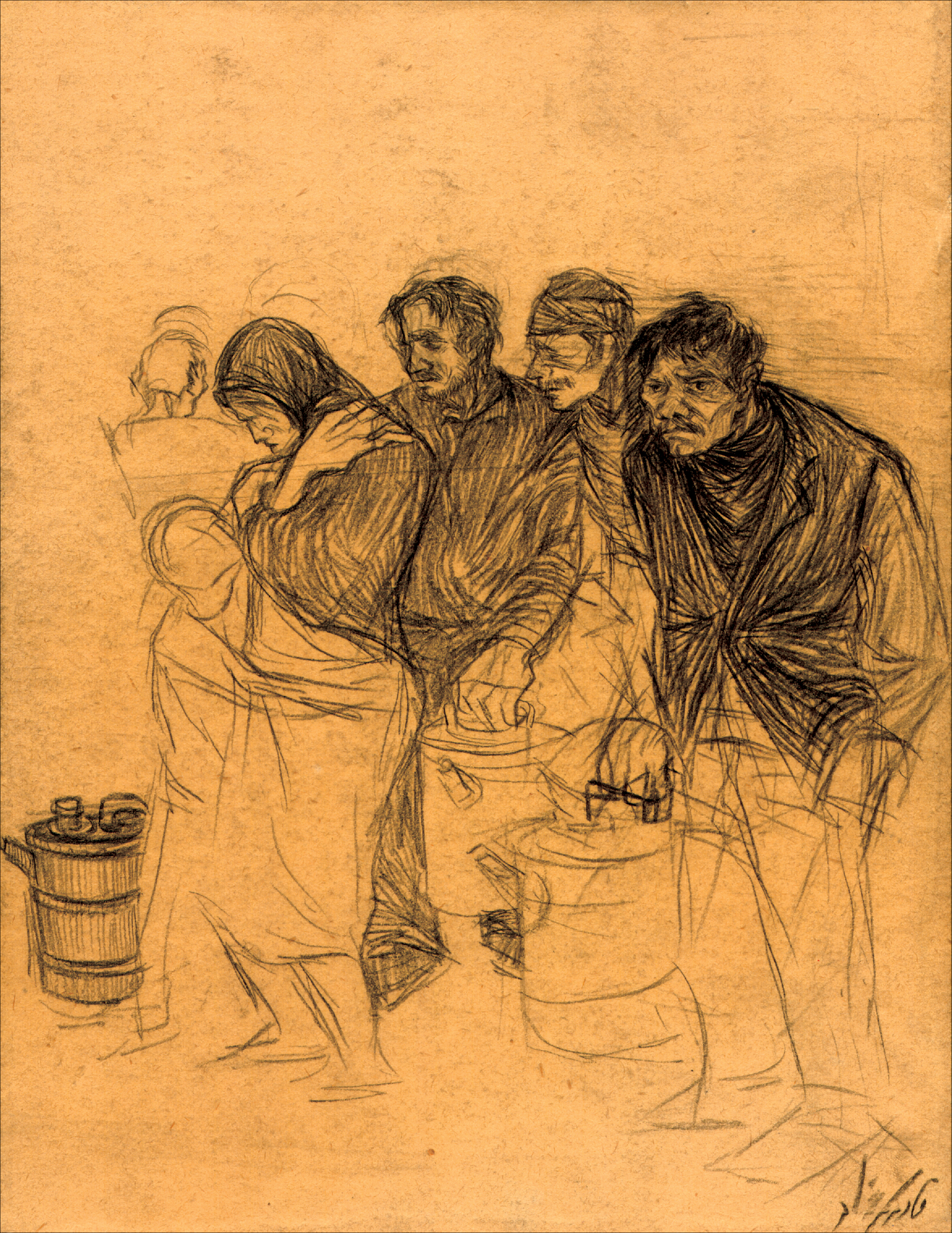 صف نفت(طراحی برای مطبوعات)، نیلوفر قادری نژاد، مداد روی کاغذ کاهی، 21×27 سانتیمتر، 1357