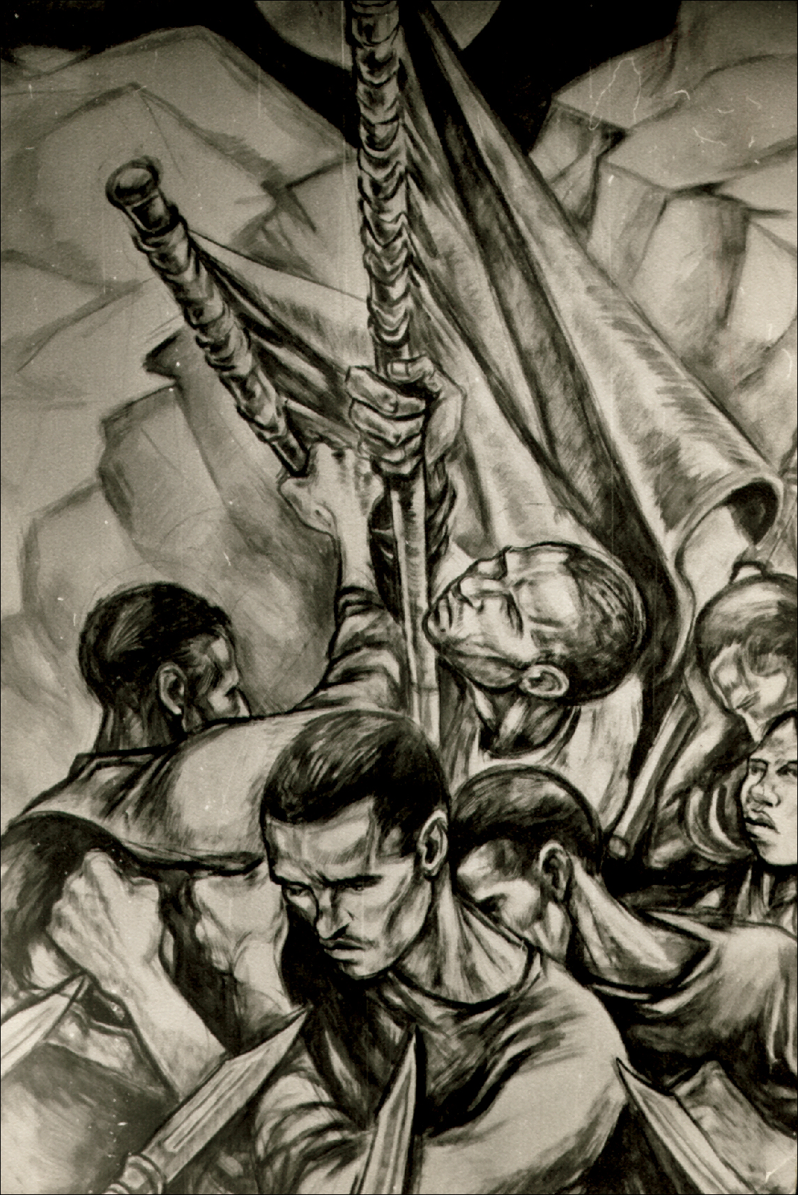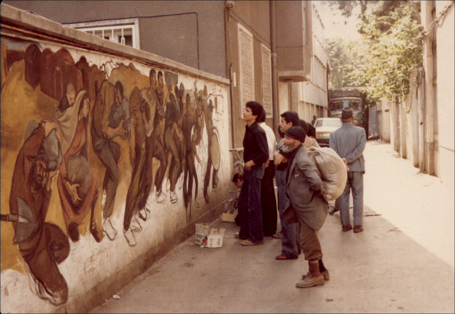 انقلاب، نیلوفر قادری نژاد با همکاری مسعود سعدالدین و هانیبال الخاص، رنگ و روغن روی دیوار دانشکده هنری زیبای دانشگاه تهران، 700×300 سانتیمتر، 1358