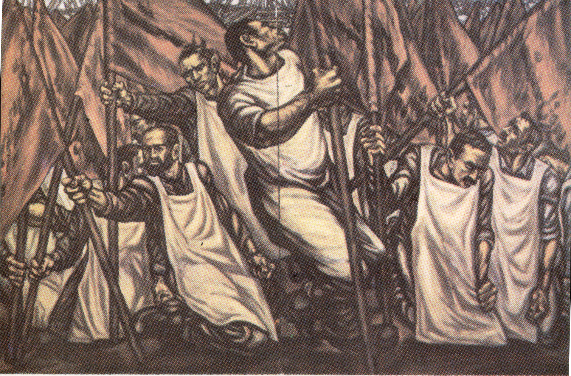 قیام کارگران، مسعود سعدالدین، رنگ و روغن روی بوم، 300×150سانتیمتر(2 لته)، 1359