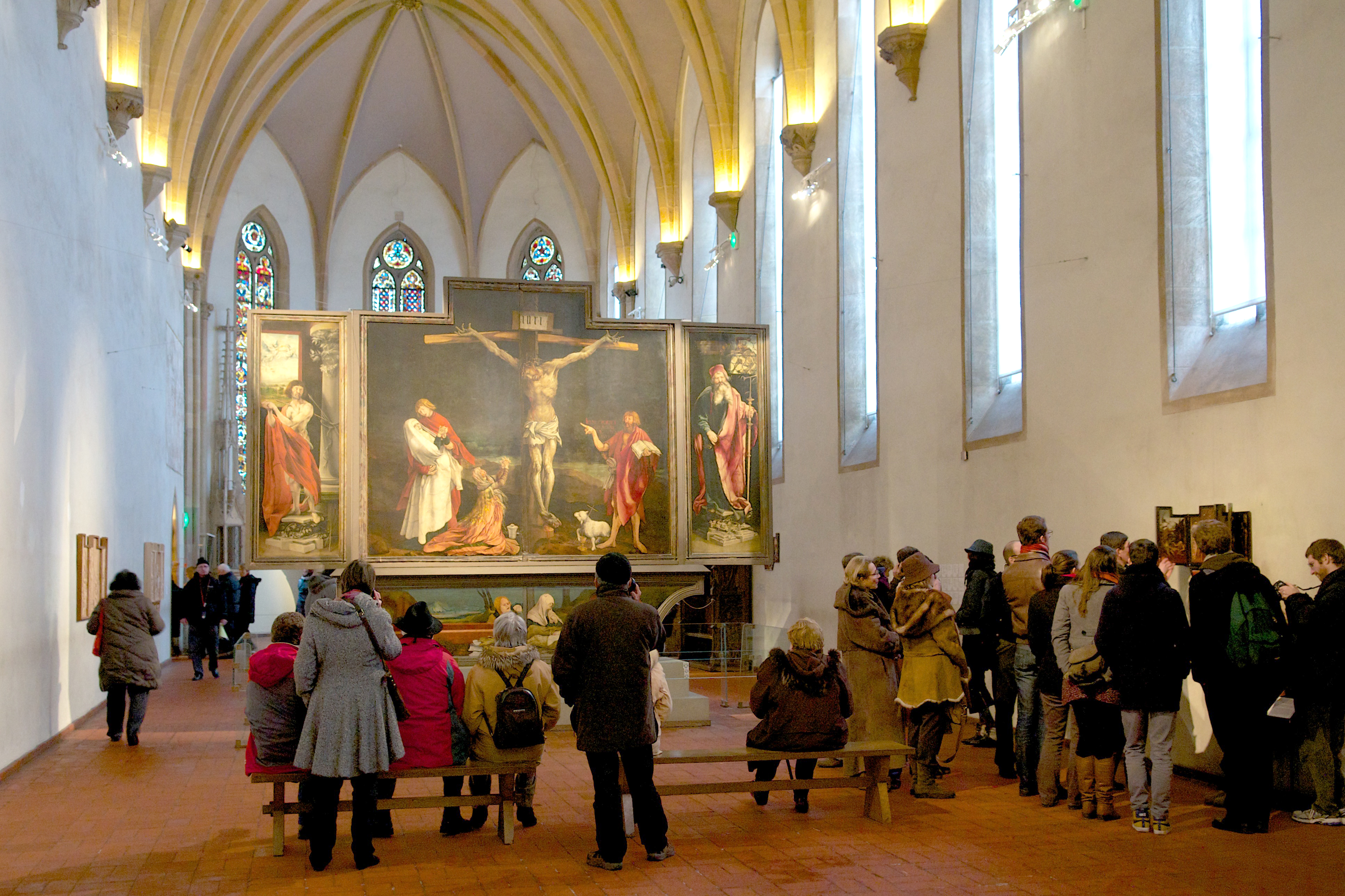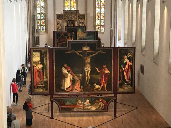 افراد حاضر در سمت چپ؛ یعنی مریم مادر مسیح و یوحنای انجیلی که مسیح از او درخواست کرد که از مادرش مراقبت کند، با مشاهدۀ جان کندن وی نهایت درد روحی را متحمل میشوند. آن دسته از دچارشدگان به طاعون که در مقابل این اثر محرابی زانو میزدند. با این تصور از مشقت زمینی و انسانی رابطه برقرار میکردند.