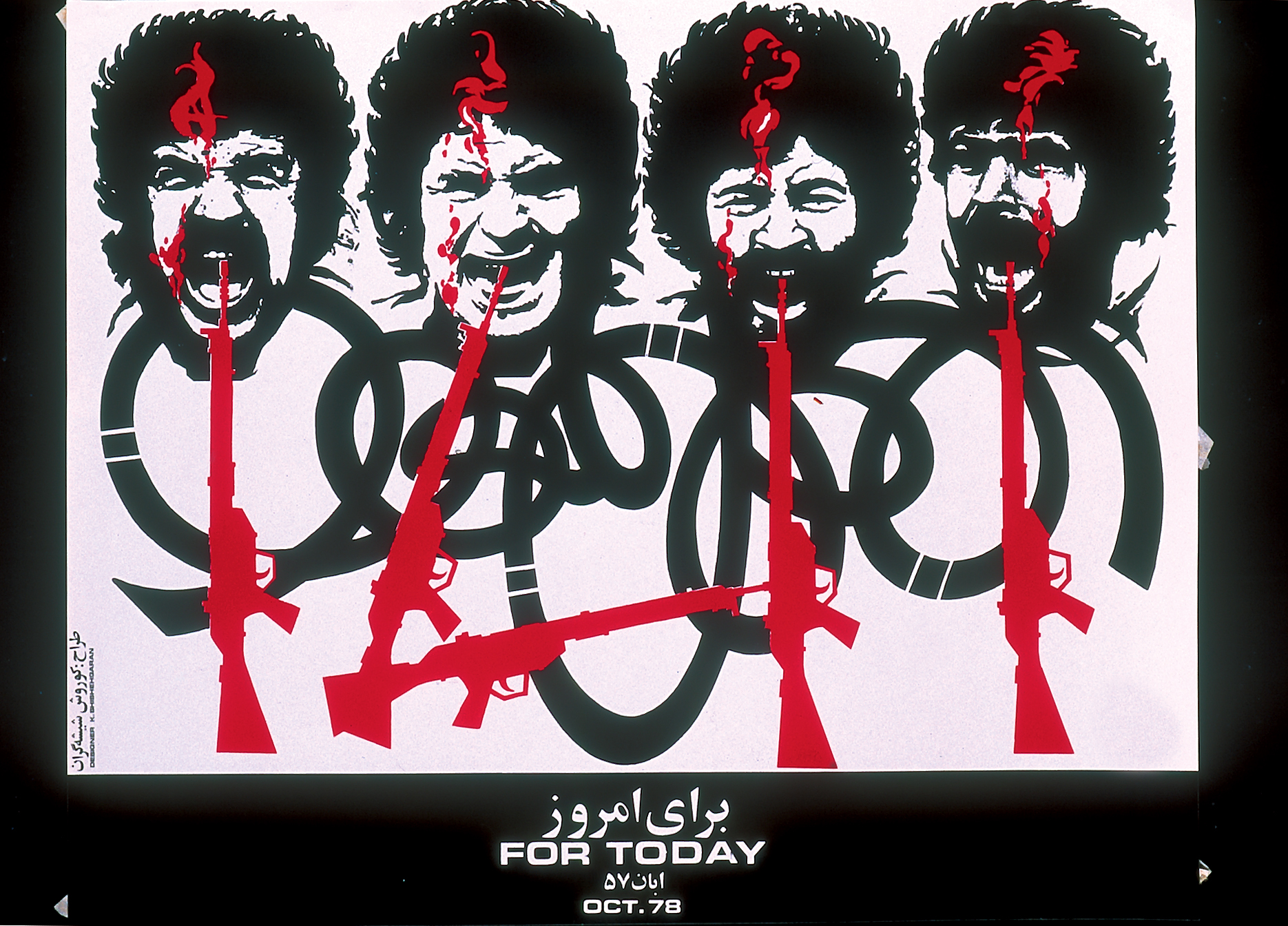 همچنین کوروش شیشهگران در آبان همان سال پوستر مهیجی اجرا کرد با نام «برای امروز» که ضمن برخورد ساده با فرم و رنگ بسیار تأثیرگذار بود؛ در بخش بالایی این پوستر، پرتره تعدادی از جوانان انقلابی قرار گرفته است که در حال فریاد زدن هستند؛ تعدادی تفنگ نیز از پایین به بالا به سمت دهان آنان نشانه رفته است؛ اما یکی از تفنگها فرو افتاده و یکی دیگر نیز در حال افتادن است؛ حد فاصل پرترهها و تفنگها با خطوط پیچانی که به صورت کارکتر جدا نشدنی از آثار کوروش شیشهگران درآمد، اجرا شده است که به نوعی آنها را از نظر بصری به هم پیوند میدهد؛ رنگ کل طرح سیاه و تفنگها به رنگ قرمز اجرا شدهاند؛ لکههایی از رنگ قرمز به عنوان خون بر صورت پیشانی پرترهها پاشیده شده است و تفنگهایی که افتاده یا در حال فرو افتادن هستند، نماد امید به آزادی و فروریختن دیوار اختناق است.