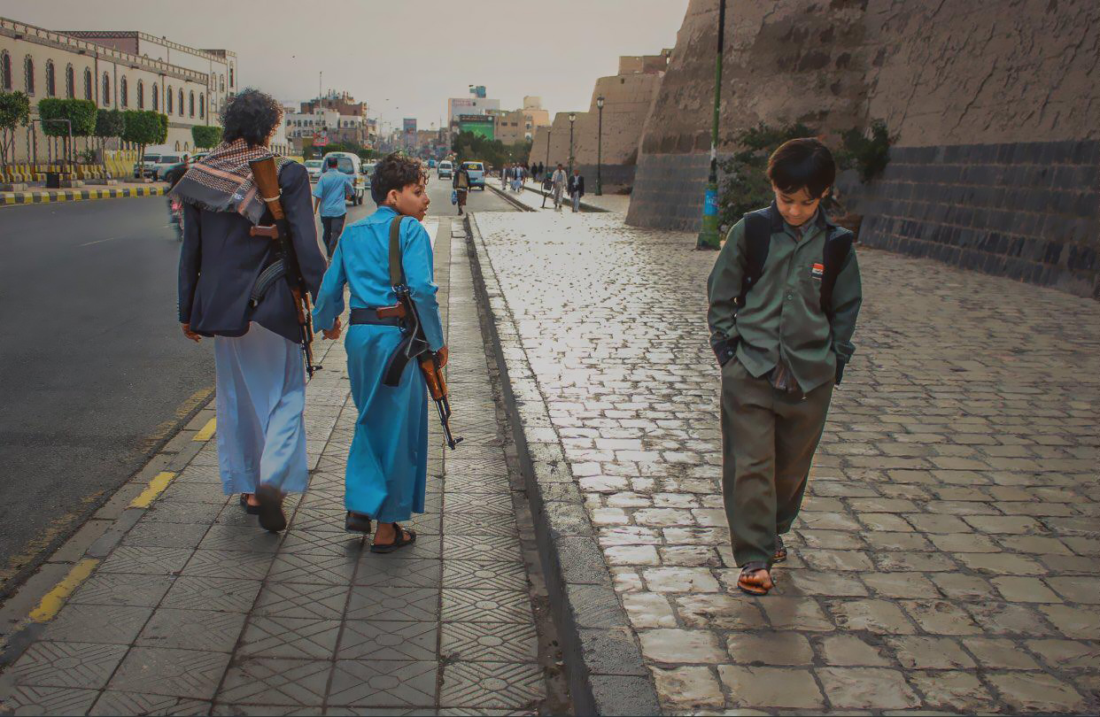 اینجا یکی از خیابان‌های قدیمی شهر صنعاست. کودکی در حال بازگشت از مدرسه است و در حالی که کوله‌پشتی روی دوشش انداخته، عمیقا فکر می‌کند. شاید در فکر آینده است و روزهای نامعلومی که انتظارش را می‌کشند. درست در همان لحظه کودکی کلاشنیکف به دوش در حالی که دست پدر مسلح خود را گرفته از کنارش رد می‌شود و به سمت جنگ می‌رود.