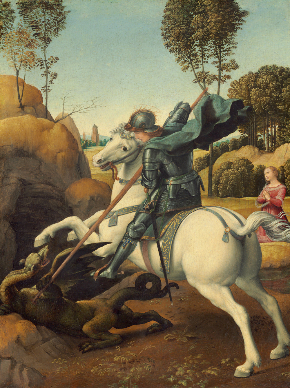 کمتر ممکن است یک پرده نقاشی از لحاظ استحکام ترکیب و طرح اجزا به پایه این اثر "رافائل"، با عنوان "سن ژرژ و اژدها" برسد. ملاحظه کنید چگونه پیچ و تاب بدن اژدها در منحنی های عضلات اسب و چتر درختان و برآمدگی های تخته سنگ منعکس می گردد؛ و از طرف دیگر خطوط قایم تنه درختان و برج دورافتاده و بازو و زانوی سن ژرژ، حرکت مستقیم و محکم نیزه را تایید می کنند.