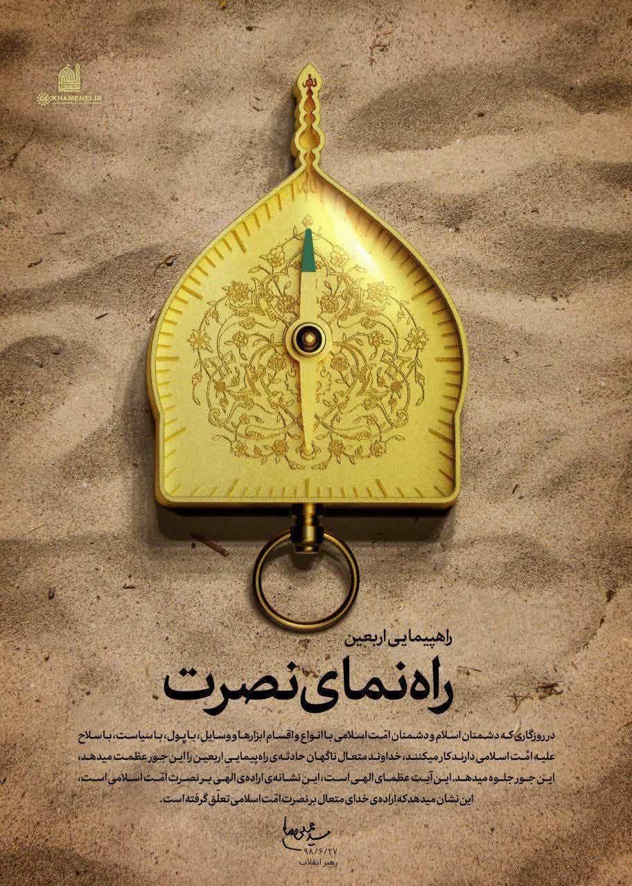 به گزارش روابط عمومی مرکز تجسمی حوزه هنری به نقل از تسنیم، در آستانه اربعین حسینی، پایگاه اطلاعرسانی مقام معظم رهبری اقدام به انتشار مجموعه پوسترهایی با مضمون پیادهروی اربعین کرده است. تازهترین پوستر این مجموعه «راهنمای نصرت» نام دارد.