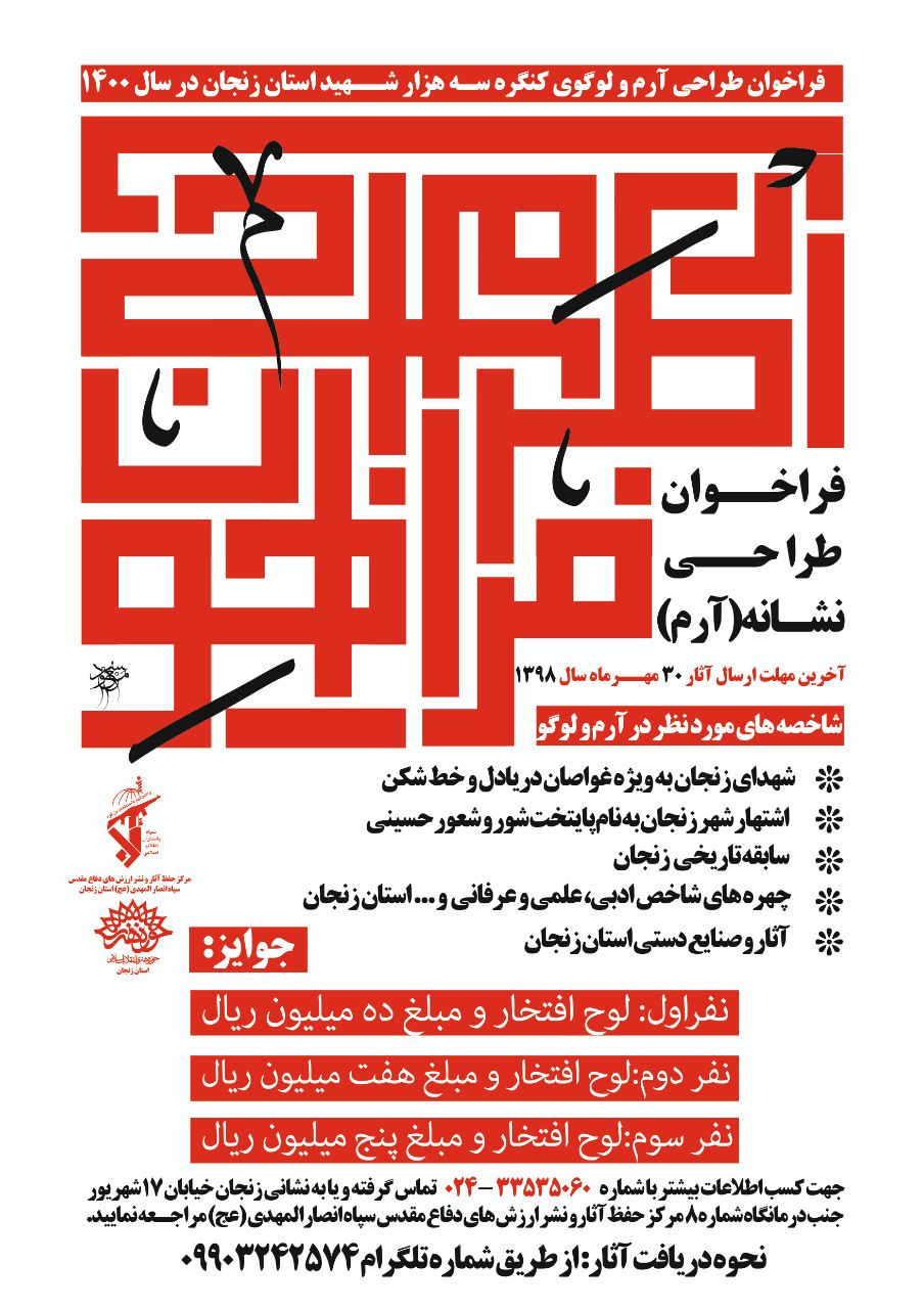 شرکت در فراخوان طراحی لوگوی کنگره سه هزار شهید استان زنجان در سال 1400، برای همه طراحان و علاقمندان هنر گرافیک آزاد است، آخرین مهلت ارسال آثار 30 مهر ماه سال 1398 خواهد بود.