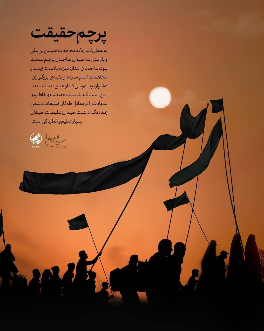 در ذیل این پوستر جملهای از مقام معظم رهبری با این مضمون درج شده است: "به همان اندازه که مجاهدت حسین ابن علی(ع) و یارانش به عنوان صاحبان پرچم سخت بود، به همان اندازه نیز مجاهدت زینب(س) و مجاهدت امام سجاد(ع) و بقیه بزرگواران، دشوار بود.درسی که اربعین به ما میدهد این است که باید یاد حقیقت و خاطره شهادت را در مقابل طوفان تبلیغات دشمن زنده نگه داشت. میدان تبلیغات، میدان بسیار عظیم و خطرناکی است."