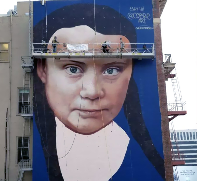 این اولین باری نیست که این دختر نوجوان حامی محیط زیست به عنوان سوژه هنر خیابانی انتخاب میشود. اوایل سال جاری «جودی توماس» هنرمند بریتانیایی یک نقاشی پانزده متری از «گرتا تونبرگ» را روی ساختمان مقابل کارخانه معروفی در بریستول خلق کرد.