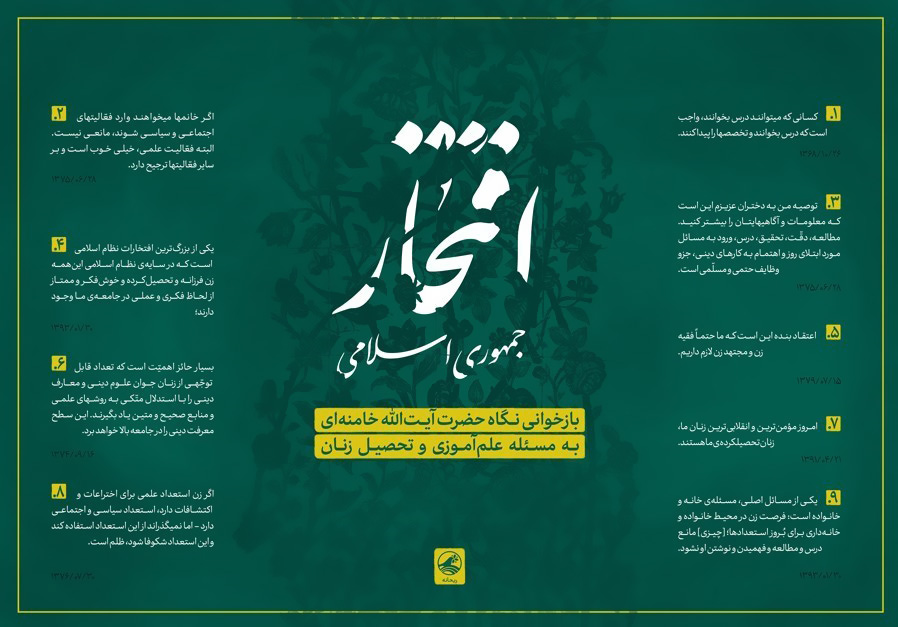 اینفوگرافیک «افتخار جمهوری اسلامی» شامل مروری بر نگاه رهبر معظم انقلاب به مسئله علم‌آموزی و تحصیل زنان است.