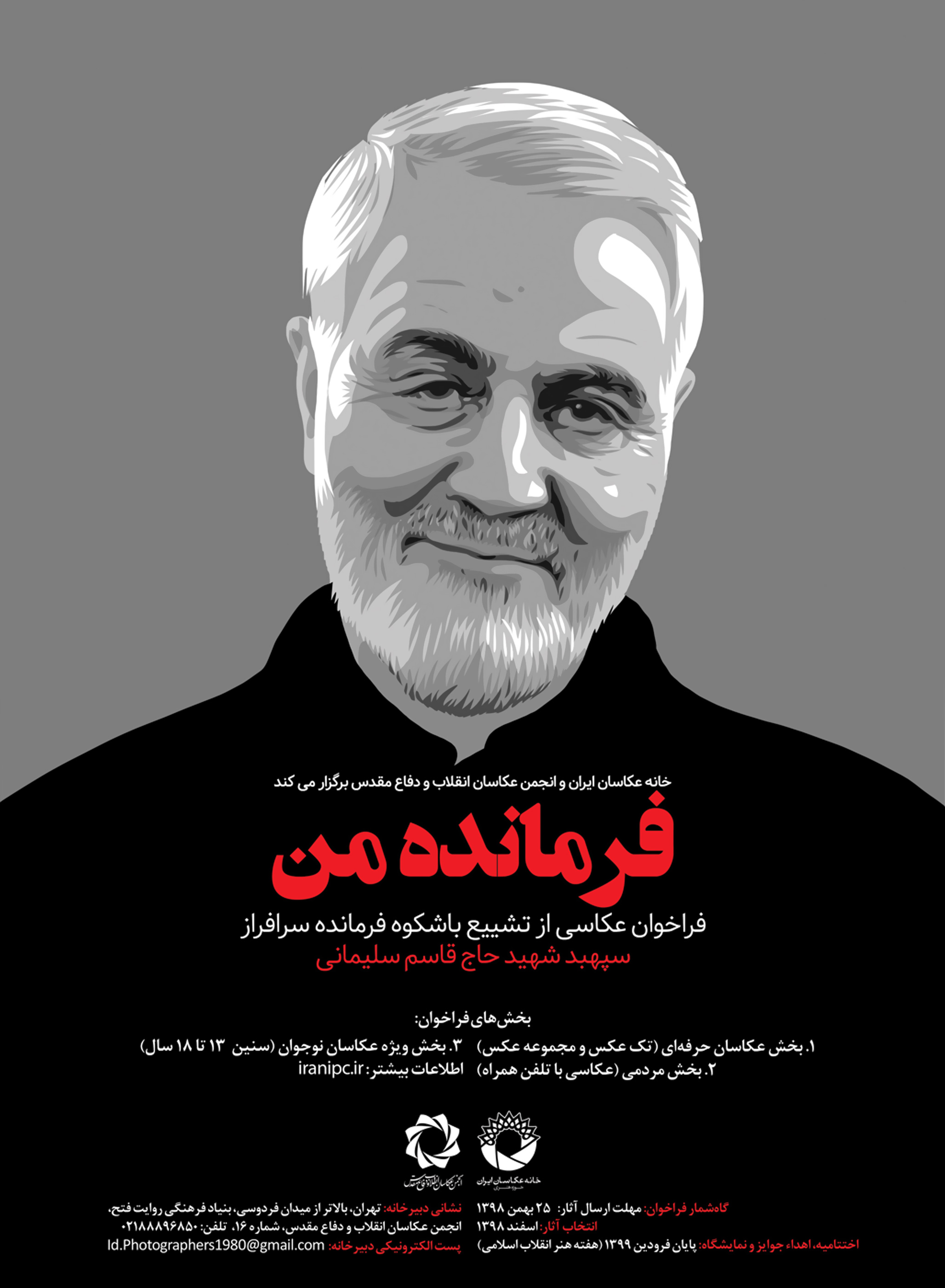 به گزارش روابط عمومی مرکز تجسمی حوزه هنری، خانه عکاسان ایران با همکاری انجمن عکاسان انقلاب اسلامی و دفاع مقدس، فراخوان عکاسی با عنوان «فرمانده من» را با موضوع تشییع باشکوه فرمانده سرافراز سپهبد حاج قاسم سلیمانی برگزار میکند.